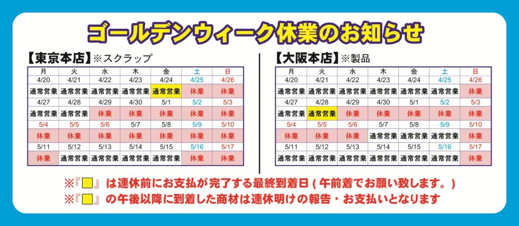 ゴールデンウィーク期間中の休業日およびお支払いスケジュールについて、下記の通りご案内申し上げます。